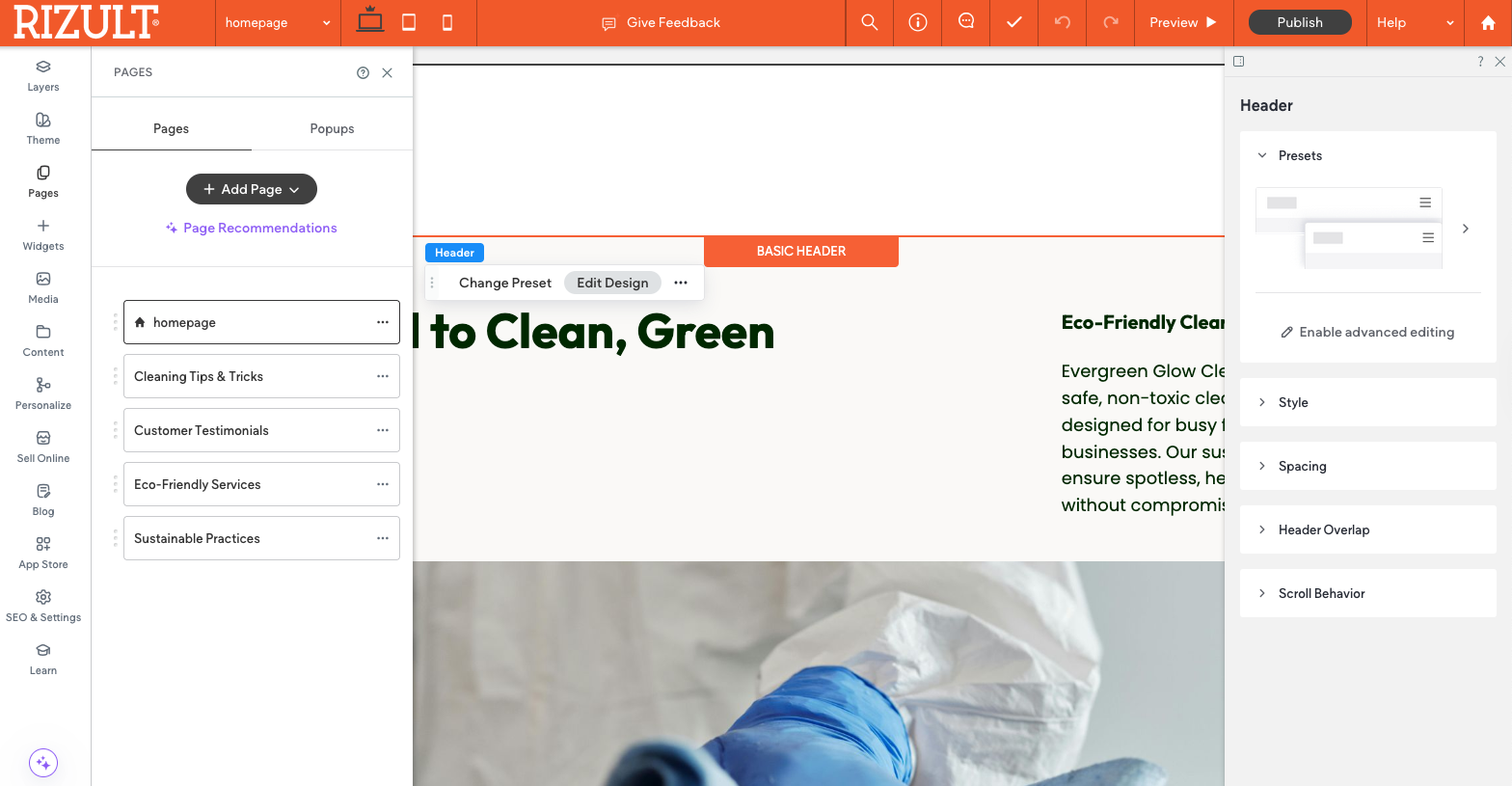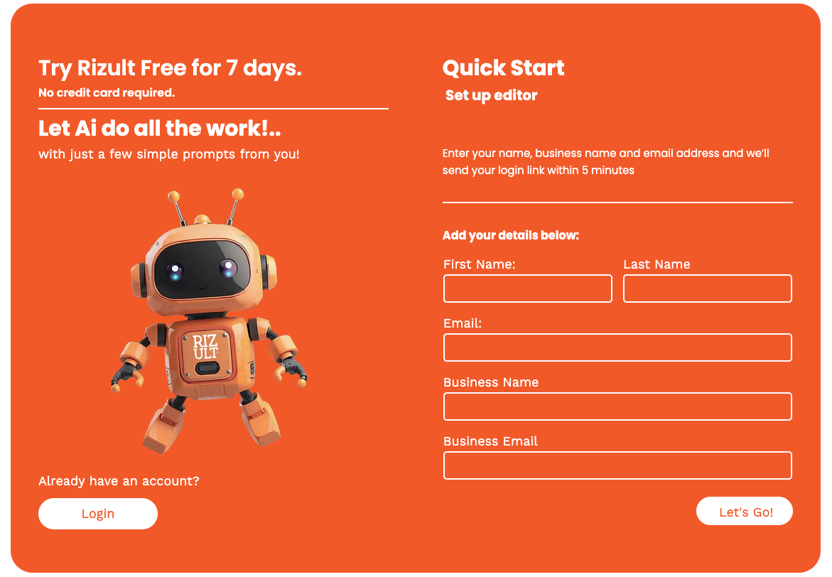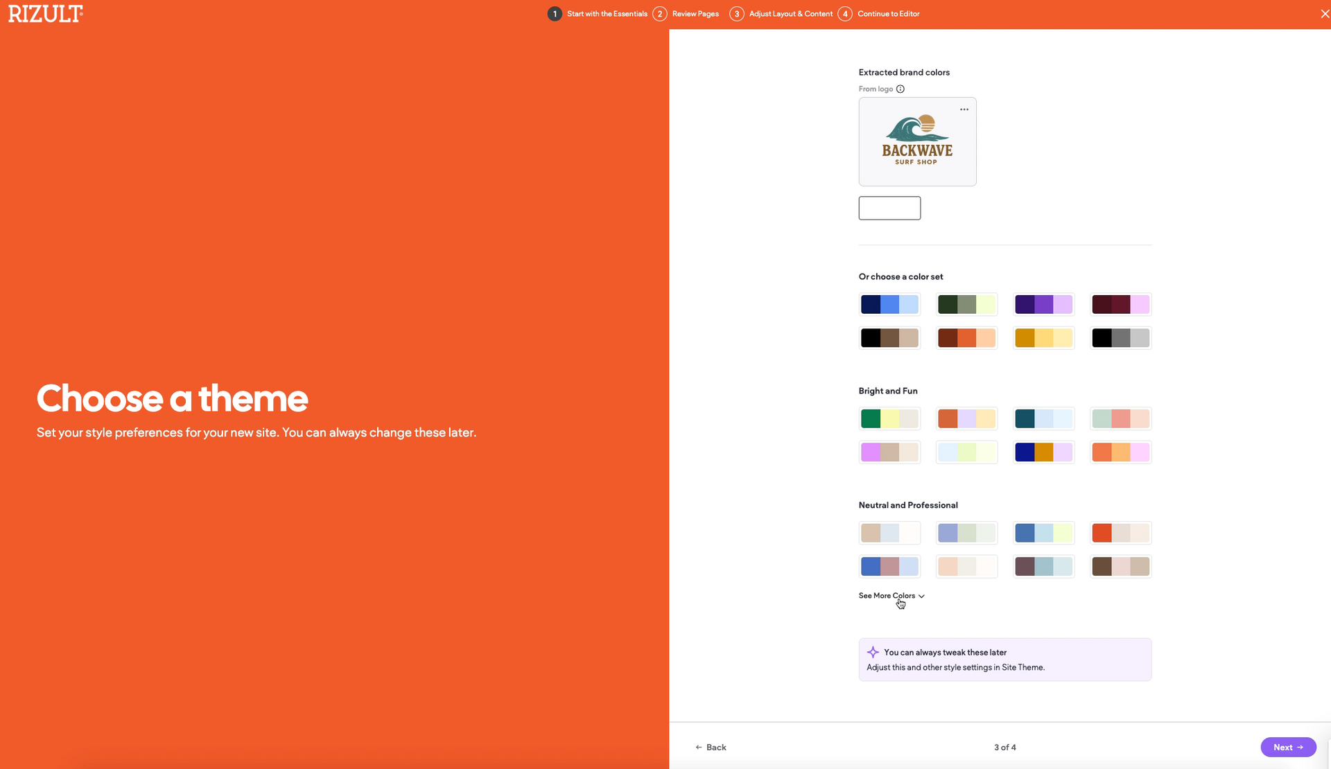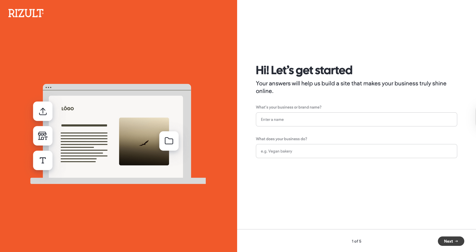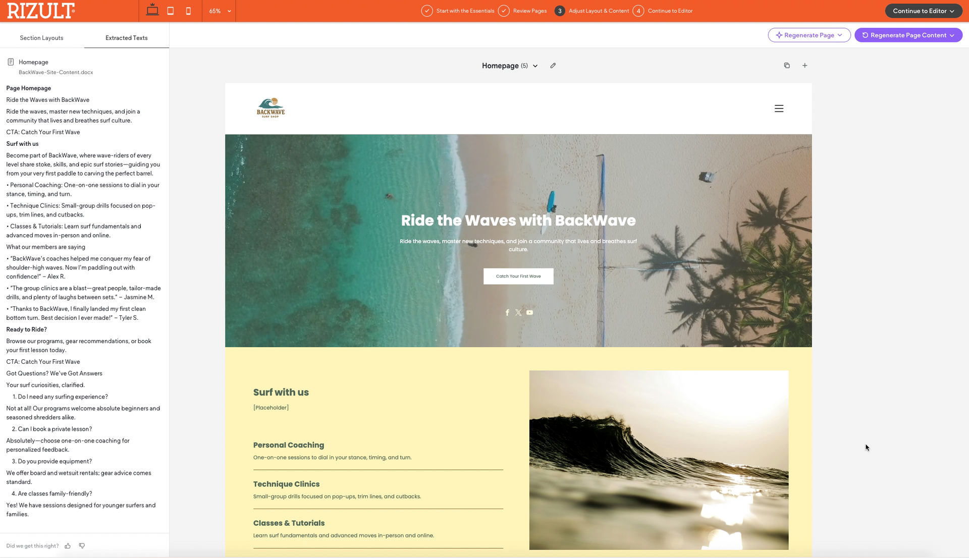 - Rizult builds your full website with your content. If a page doesn’t look right, regenerate it or continue to the editor to tweak anything.