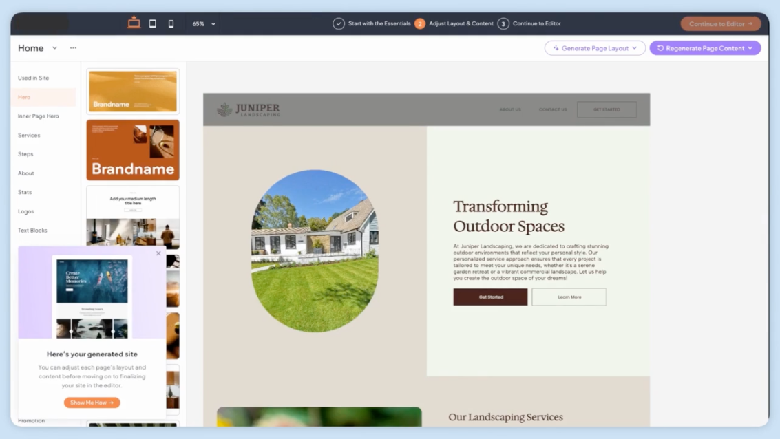 - When you’re happy with your draft, click “Continue to Editor.” This is where you can fine-tune every detail and make the site truly yours. It’s similar to tools like WordPress or Elementor, but much simpler — so don’t worry if you haven’t used those before.