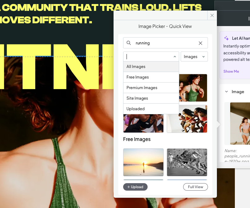 - Click on any image to replace it with one of your own (just upload from your computer) or select a stock image — free or paid. Note: Paid images/videos come from a partner site, and payment is made directly to them.
