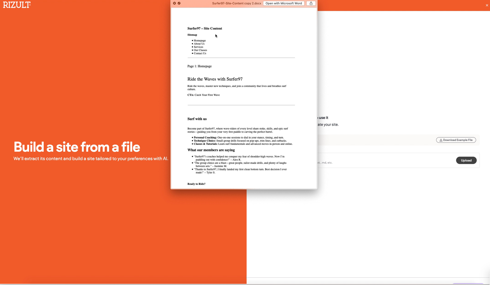 How it works: Upload your Word file with all your text and images, and our AI structures it into a complete website.